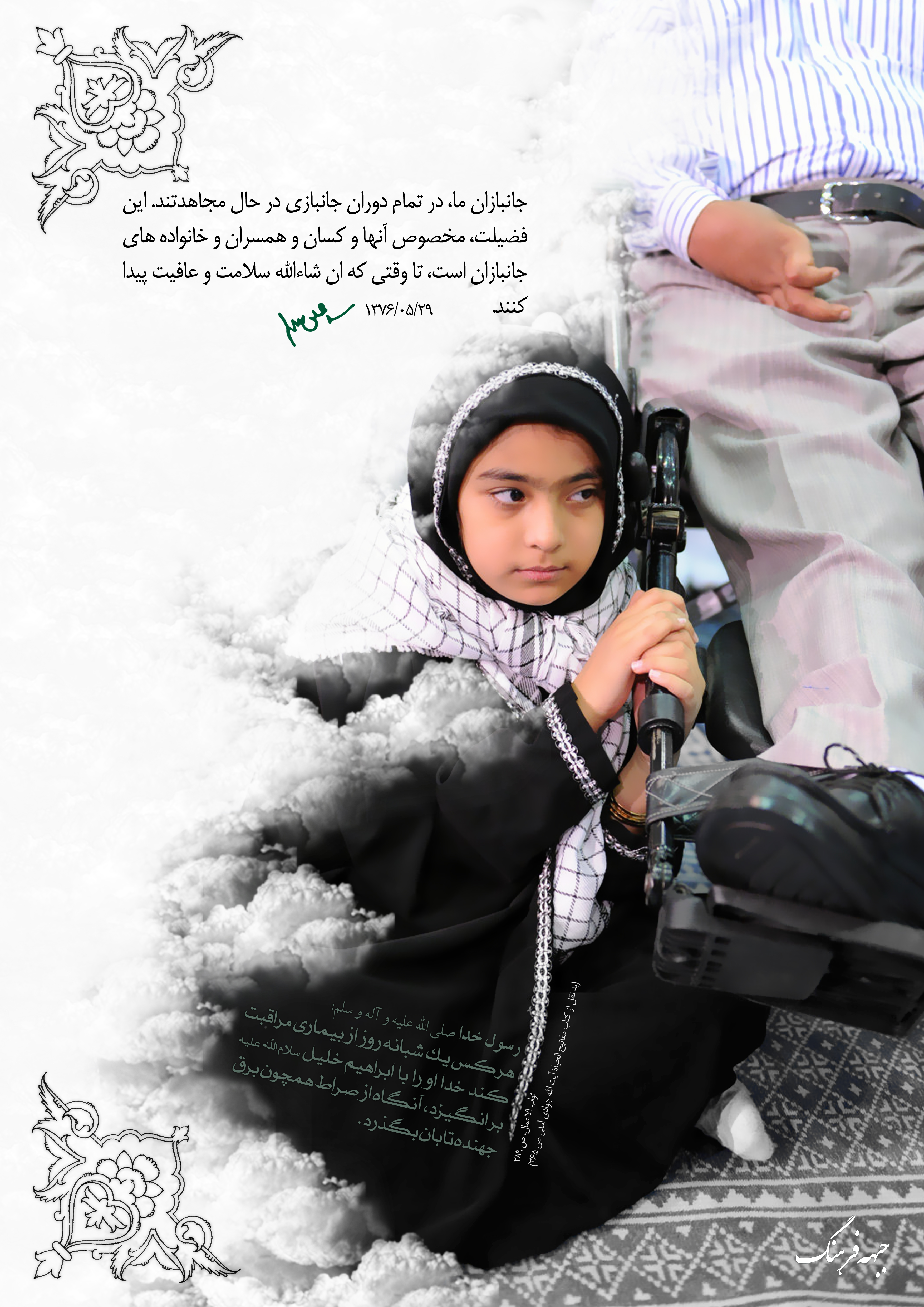 و لذا حقیر هم با تمام کاستی ها و عیوب کارهایی که انجام دادم، پوسترها را که به نیّت 14 معصوم علیهم السلام بوده تقدیم حضرت امام خامنه ای مدظله العالی کردم که اقتدار امّت اسلام است. چند روز گذشته کتابی بعنوان هدیه از سوی دفتر رهبر معظم انقلاب حضرت آیت الله العظمی خامنه ای حفظه الله تعالی مزد کارم شد. الحمدلله